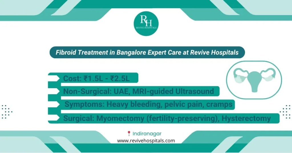 In Bangalore, Revive Hospitals is one of the best hospitals for fibroid treatment. They have skilled gynecologists and surgeons. The hospital provides advanced technology and equipment in treatment, advanced diagnostic tools, and modern treatments. All the patients at Revive receive personalized care that suits their condition. The hospital has a high success rate many positive reviews from patients.