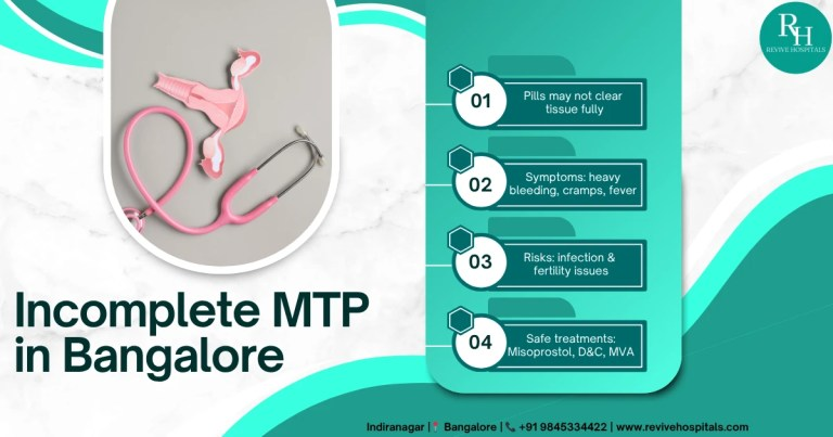 When there is an incomplete MTP, the patient would be affected in many ways, like excessive bleeding due to the amount of tissue retained, other severe symptoms and the overall health of the patient. Based on these, further treatments are decided as the patient requires complete recovery from those difficulties too. At Revive Hospitals, Bangalore, gynaecologists provide both medical and surgical treatments that ensure safety and personalised care for you to manage the condition well.